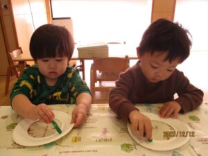 まずは紙皿にクレヨンでぐるぐる…