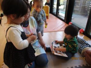 先生と絵本を見るのも大好きな子どもたち。