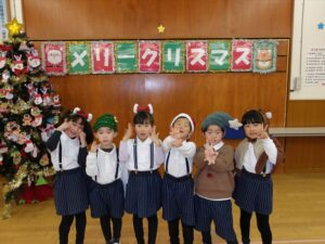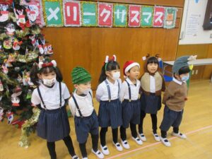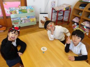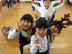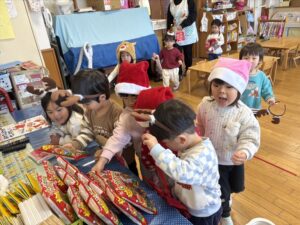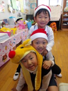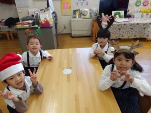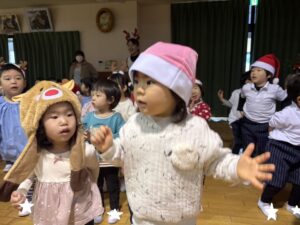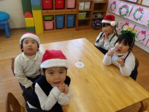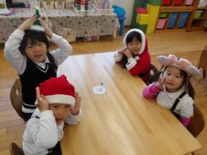 サンタやトナカイなどかわいい被り物をして、子どもたちは朝からとてもわくわく♪