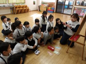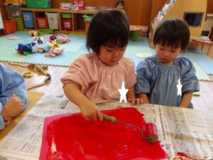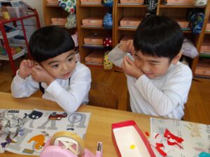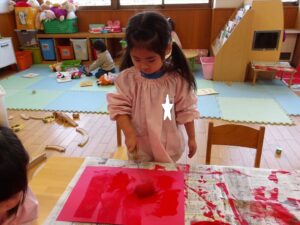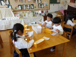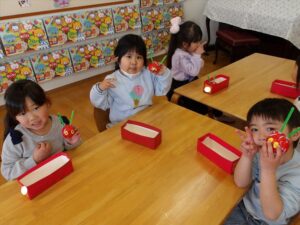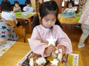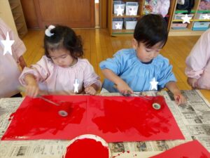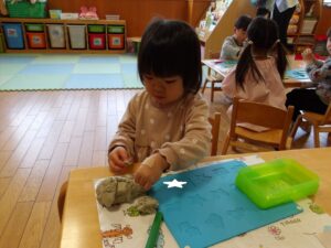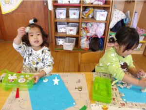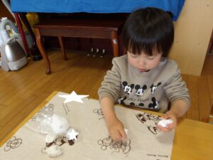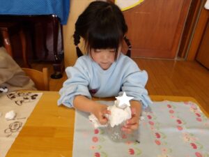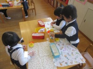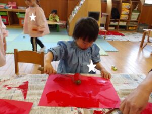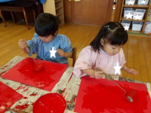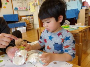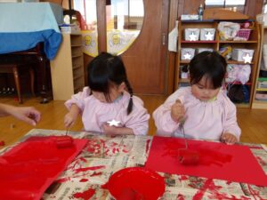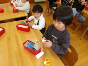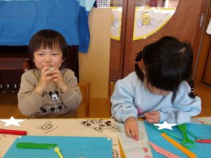 1月13日(火)❁年長・・・英語、月刊誌、カルタ❁年中・・・作品展の製作❁年少・・・リトミック、作品展の製作❁たまひよ・・・作品展に向けて絵の具や紙粘土製作