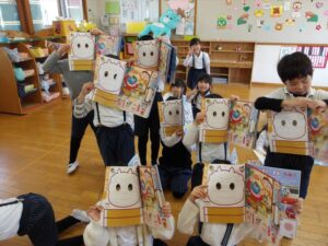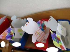 作品展に向けて、絵本のしろくまちゃんこぐまちゃんの「さよならさんかく」をテーマに