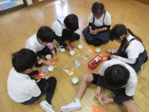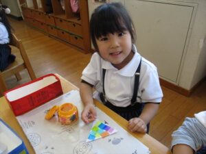 透明おりがみをのりで貼り、カラフルな色に親しみながらお友だちと楽しく製作していましたね