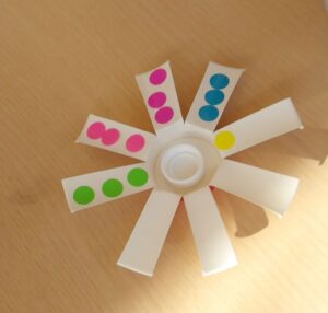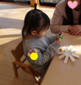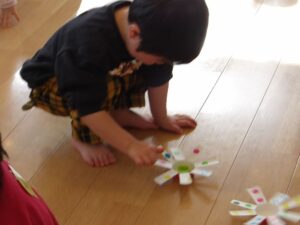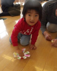 にこにこ教室がありました。紙コップを使ったこま作りではみんな上手に回すことができました。