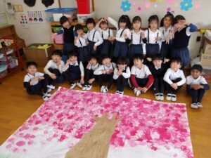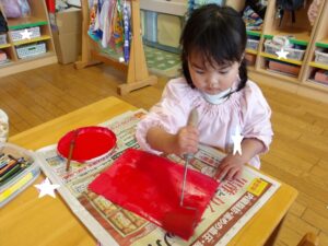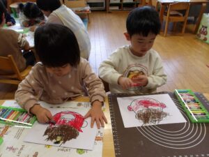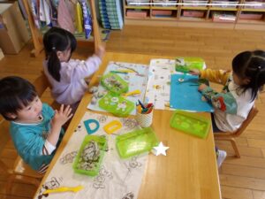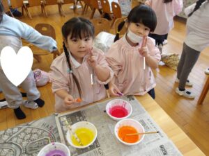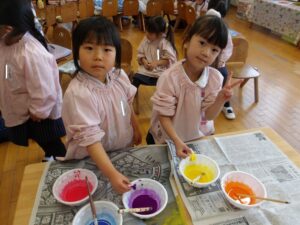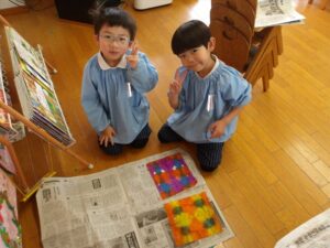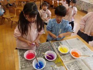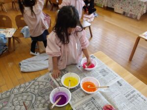 共同製作の続きやペーパータオルで染め紙をしました!