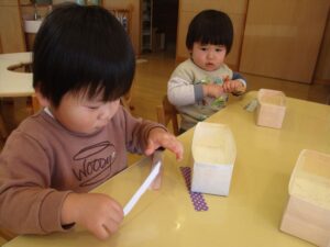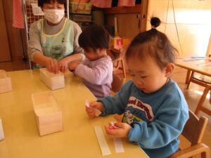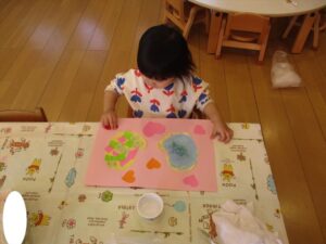 もう片方は、好きな模様の折り紙を3枚ちぎり