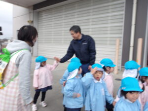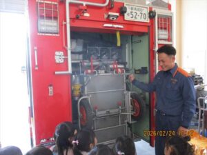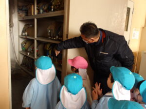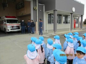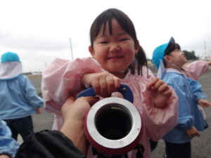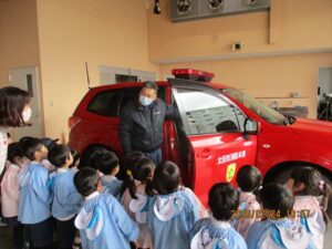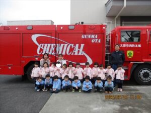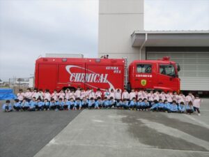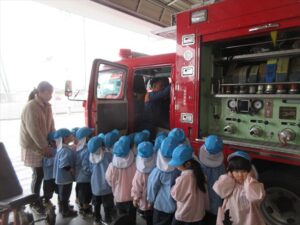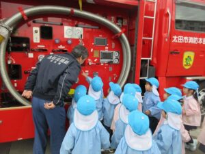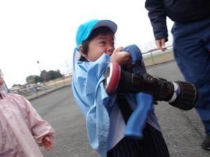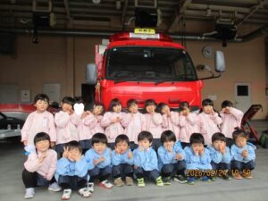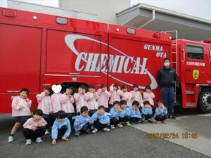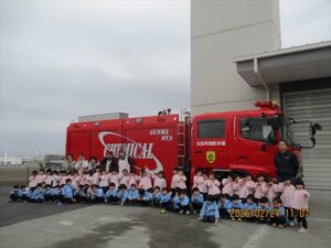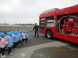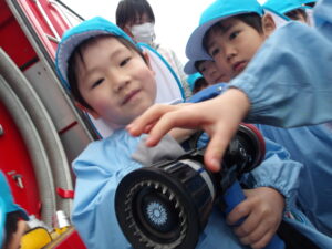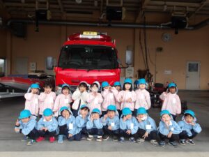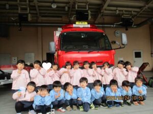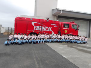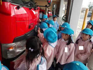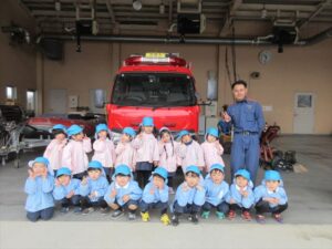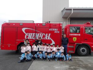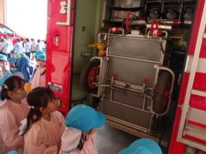 ホースの部品を持たせてもらったり、集合写真を撮らせてもらったり、出動するところも見ることができて子どもたちは貴重な体験をすることが出来、帰って来てからも楽しかった!!という声がたくさん聞こえてきました。