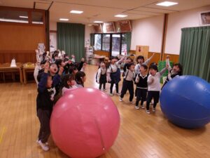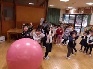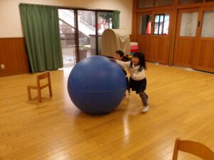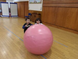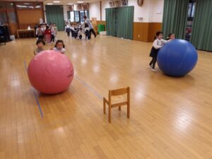 ゲームは大玉転がしリレーをして盛り上がりました![]()