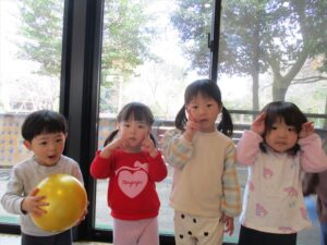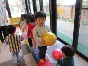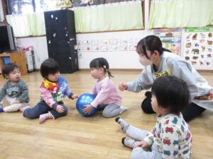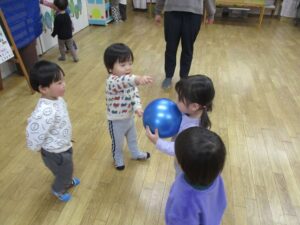 みんなで円になり、ボールを隣のお友だちに「パス」