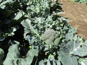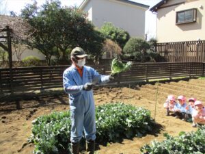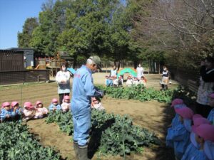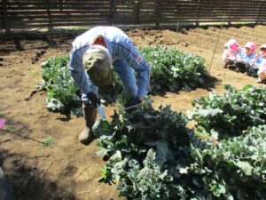 畑でとれたばかりのブロッコリーに子どもたちは興味津々