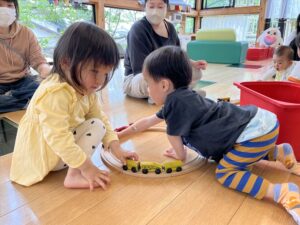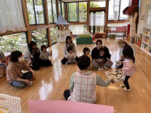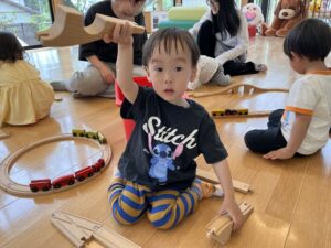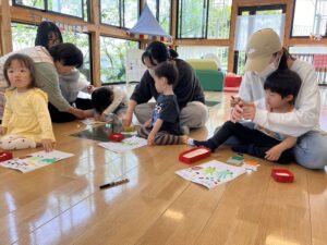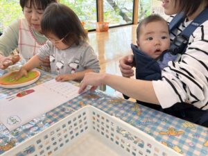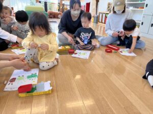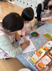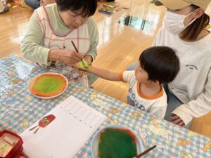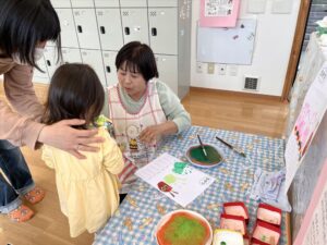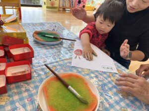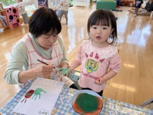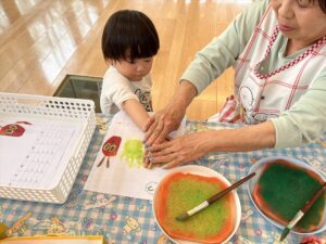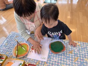初めは絵の具を塗ることに抵抗がある子もいましたが、周りのお友だちが手形をやっているのを見て「やってみよう!」と思ってくれたようで