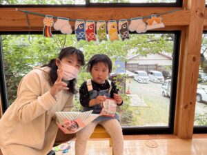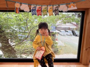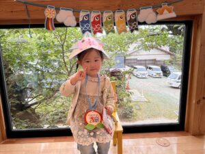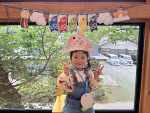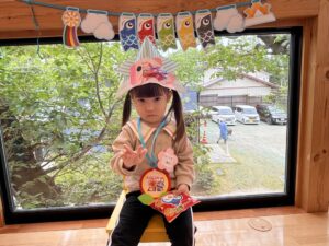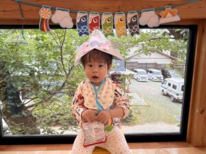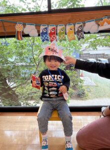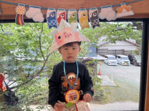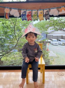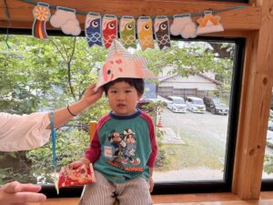兜はママに作ってもらい、お友だちが作ったこいのぼりを兜に貼ってお写真を撮りました!!