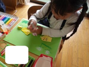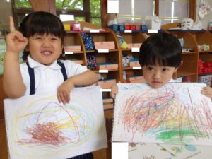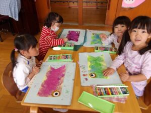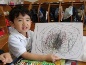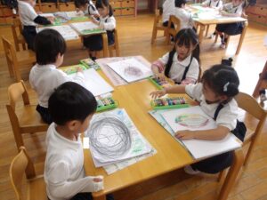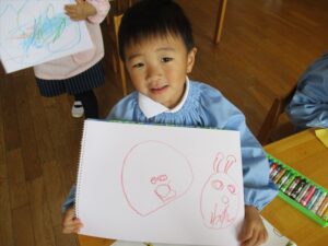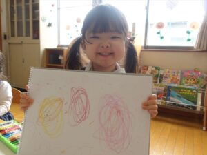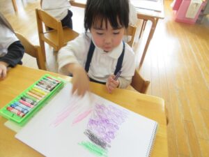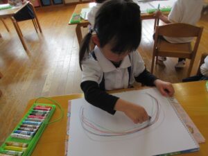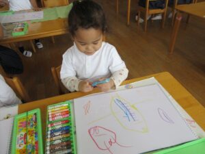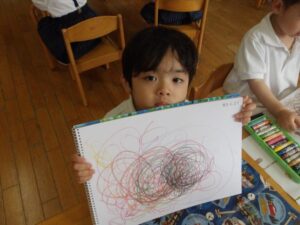 今日はクレヨンを使って自由画帳にお絵描きをしました