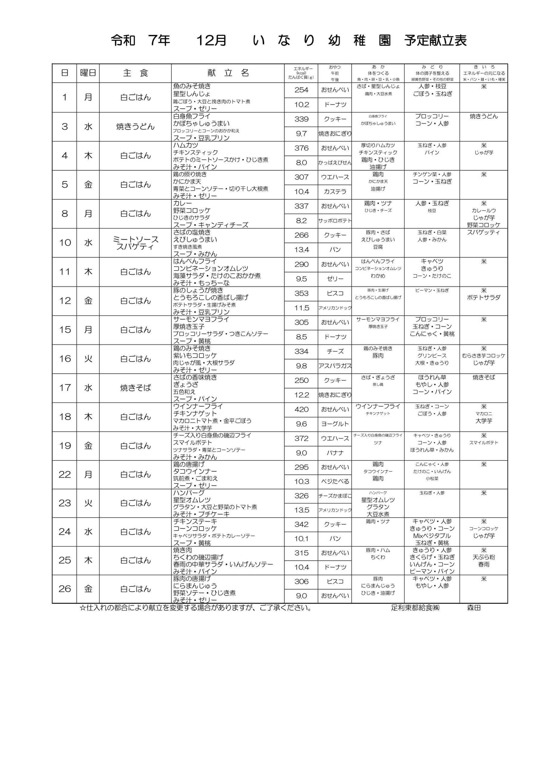 保育園 12月 献立
